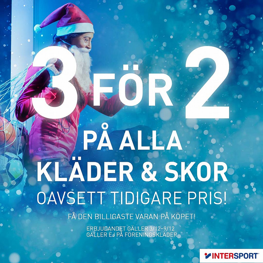 Passa på att fynda julklappar eller skäm bort dig själv med någon snyggt och skönt under denna veckan när Intersport kör 3 för 2 på alla kläder&skor t.o.m söndag 9/12!