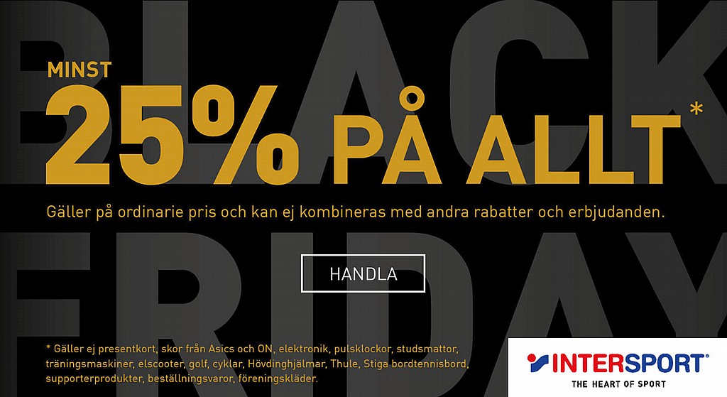 Den 25–29 november firar vår samarbetspartner Intersport Black Friday och ger minst 25% på allt* + massa grymma superklipp.